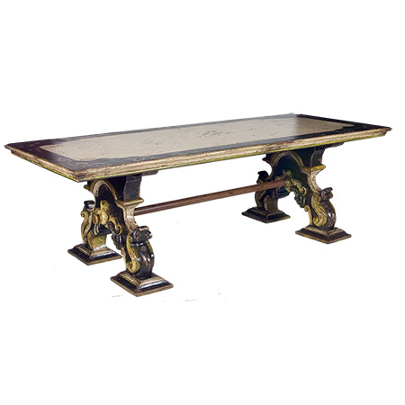 Product: Dining Table Dimensions: 96"w x 42"d x 30"h Style: Hand Painted Wood Color: PL14/PL02/PL24 Black Gold/Sand/Royal Gold Motif: 13/9 - Scrolls/Monochromatic Fruits Origin: Brazil Product ID: BBC-DIN-PT-616
