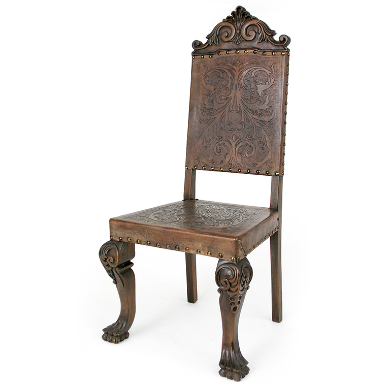 Product: Side Chair Dimensions: 19"w x 19"d x 47"h Style: Hand Carved Wood & Hand-Tooled Leather Color: WS05 Coffee Motif: 0 Origin: Brazil Product ID: BRQ-SCH-CV-703 MSRP: $2,740
