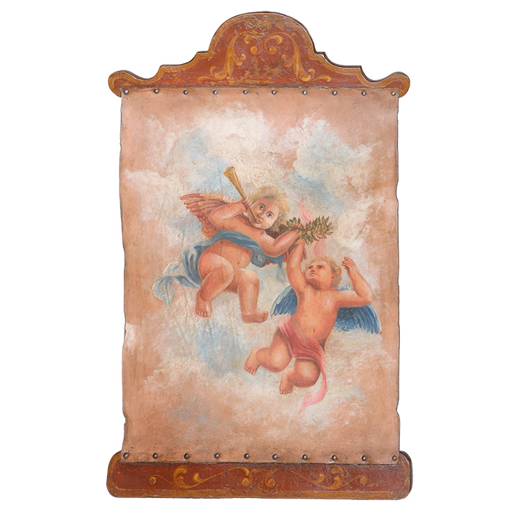 Product: Parchment (Painting on leather) Dimensions: 30"w x 47"h Style: Hand Painted Wood/Leather Color: PL07/PL02 Terracotta Motif: 21 - Angels Origin: Brazil Product ID: CLN-ACC-PT-1607 MSRP: $2,592