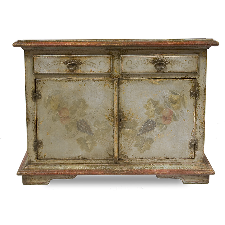 Product: Buffet Dimensions: 43"w x 19"d x 39"h Style: Hand Painted Wood Color: PL23 Silver Leaf Motif: 1 - Fruits Origin: Brazil Product ID: CLN-BUF-PT-397b