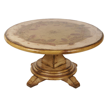 Product: Table Dimensions: 60"dia x 30"h Style: Hand Painted Wood Color: PL02/PL11 Sand/Olive Motif: 22 - Leaves Origin: Brazil Product ID: CLN-DIN-PT-614