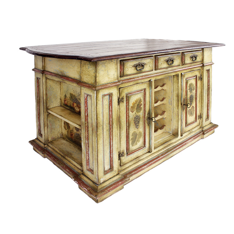 Product: Kitchen Island Dimensions: 61"w x 37"d x 41"h Style: Hand Painted Wood Color: PL02/ PL07/ WS03 Sand/ Terracotta/ Medium Brown (top) Motif: 16 - Grapes Origin: Brazil Product ID: CLN-ISL-PT-400