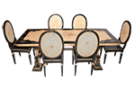 Product: 7 Piece Dining Set (1 Table + 6 side Chairs) Dimensions: Table: 96"w x 42"d x 30"h Style: Hand Painted Wood Color: PL14/ PL02/ PL24 Black Gold/Sand/ Royal Gold Motif: 13/9 Scrolls/Mono Fruits Origin: Brazil Product ID: ESB-DIN-2134