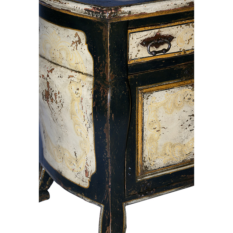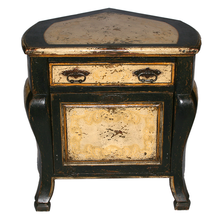 Product: Corner Cabinet Dimensions: 39.5"w x 42"d x 37"h Style: Hand Painted Wood Color: PL14/PL02 Black Gold/Sand Motif: 13 - Scrolls Origin: Brazil Product ID: LND-CAB-PT-201