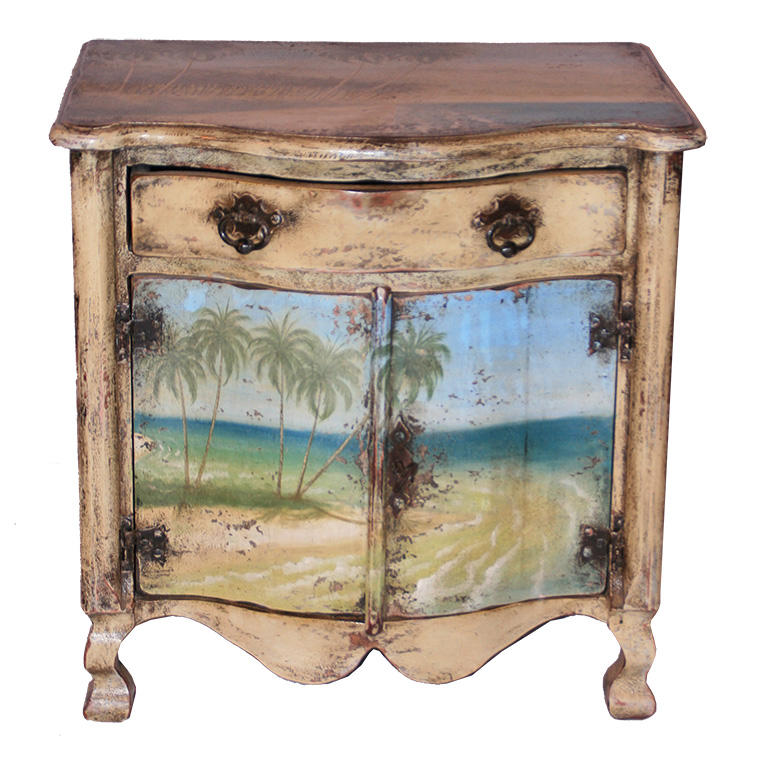 Product: Nightstand Dimensions: 30"w x 22"d x 30"h Style: Handpainted Wood Color: PL02 Sand Motif: 14 - Tropical Scene Origin: Brazil Product ID: LND-NST-PT-307 MSRP: $4,050