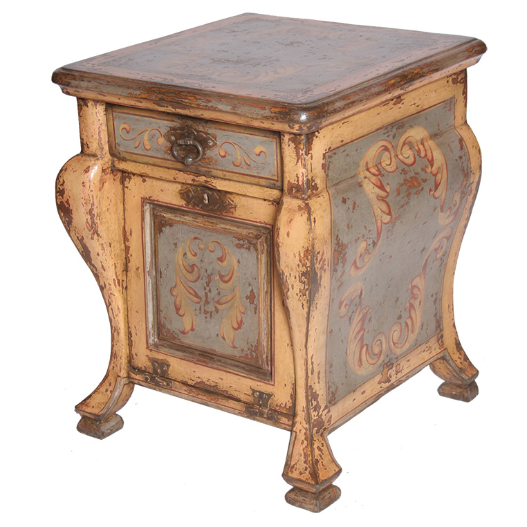 Product: Night Stand Dimensions: 24"w x 24"d x 30"h Style: Hand Painted Wood Color: PL03/PL23 Apricot/Silver Leaf Motif: 13 - Scrolls Origin: Brazil Product ID: LND-NST-PT-923a