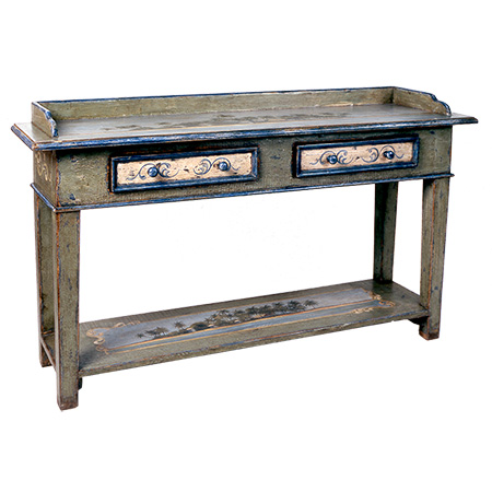 Product: Console Table Dimensions: 74"w x 16"d x 36"h Style: Hand Painted Wood Color: PL18 Celery Motif: 14 - Tropical Scene Origin: Brazil Product ID: NIA-CON-PT-514