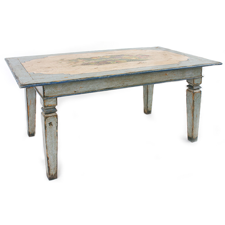 Product: Dining Table Dimensions: 72" w x 36" d x 30.5"h Style: Hand Painted Wood Color: PL15/PL01 Aqua Blue/Coconut Motif: 1 - Fruits Origin: Brazil Product ID: NIA-DIN-PT-605