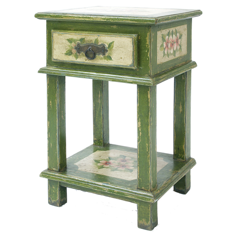 Product: End Table Dimensions: 17.5"w x 15.5"d x 30"h Style: Hand Painted Wood Color: PL13/PL01 Kiwi/Coconut Motif: 17 - Flowers Origin: Brazil Product ID: NIA-END-PT-903