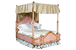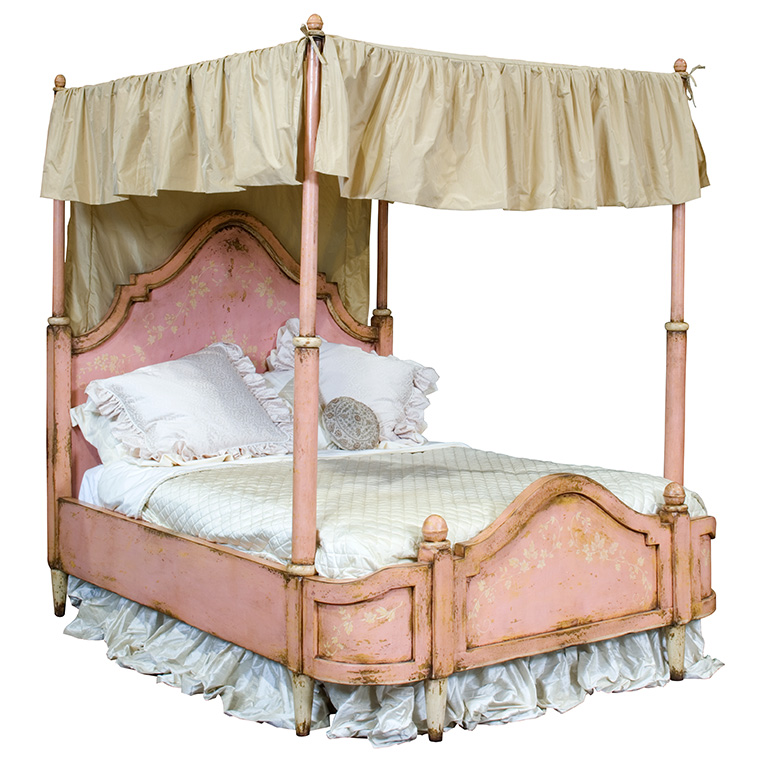 This versatile hand Painted Nina bed, can become four different beds in one. It can be just headboard and footboard, headboard with posts only, a four poster bed, or a lovely canopy bed. It's all hand painted in a sweet rose color with a french motif.