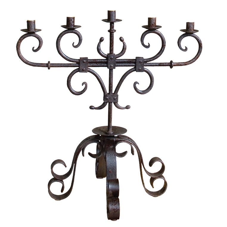 Product: Candleholder with 5 Posts Dimensions: 32"w x 19"d x 25.5"h Style: Handforged Color: Rust Motif: Origin: Brazil Product ID: RWD-CHO-FG-1601 MSRP: $1,800