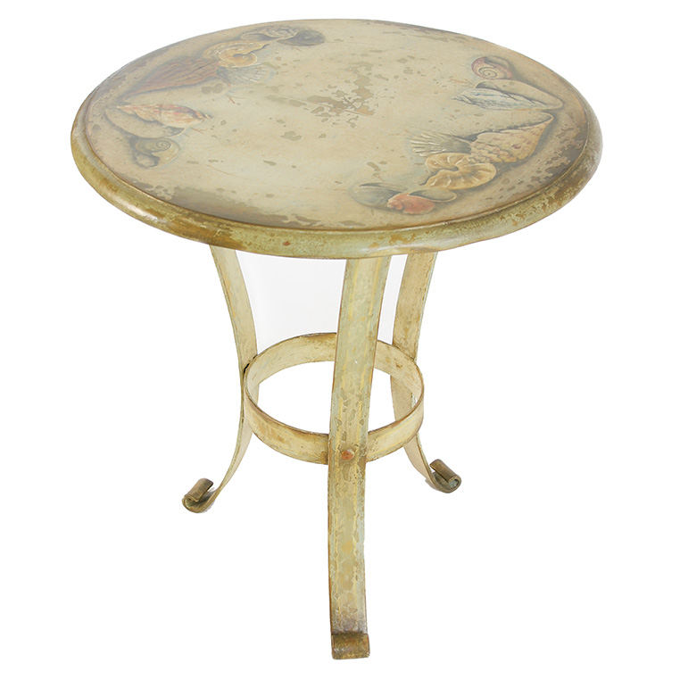 Product: Bistro Table Dimensions: 26"dia x 29"h Style: Hand Painted Wood & Iron Color: PL01 Coconut Motif: 7 - Sea Shells Origin: Brazil Product ID: VAR-BIS-PT-503