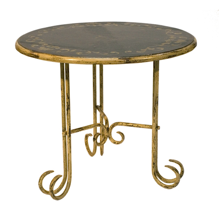 Product: Bistro Table Dimensions: 36"dia x 30"h Style: Hand Painted Iron/Wood Top Color: PL14/PL02 Black Gold /Sand (Legs) Motif: 13 Scrolls Origin: Brazil Product ID: VAR-BIS-PT-512 MSRP: $2,700